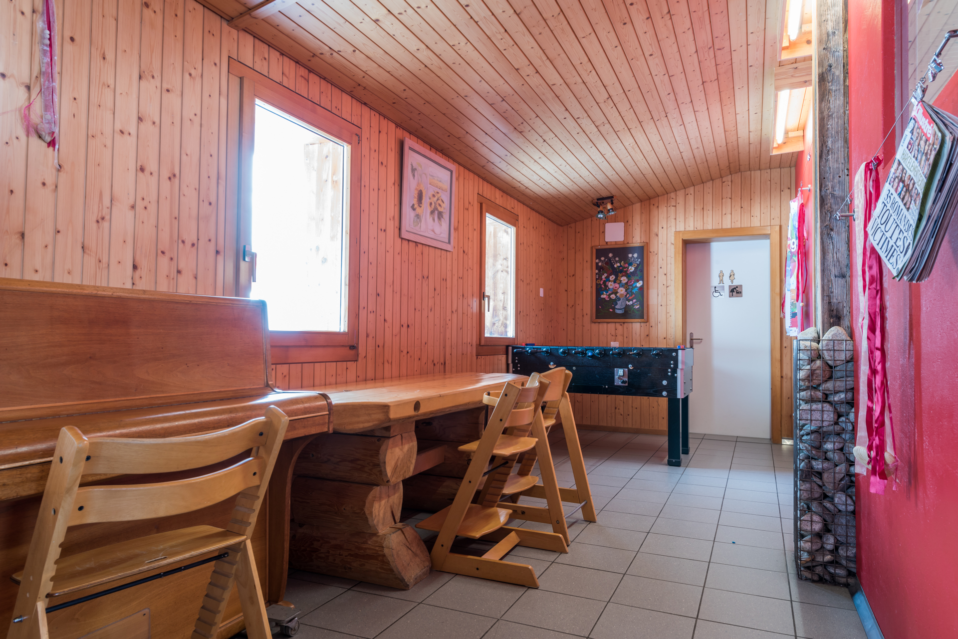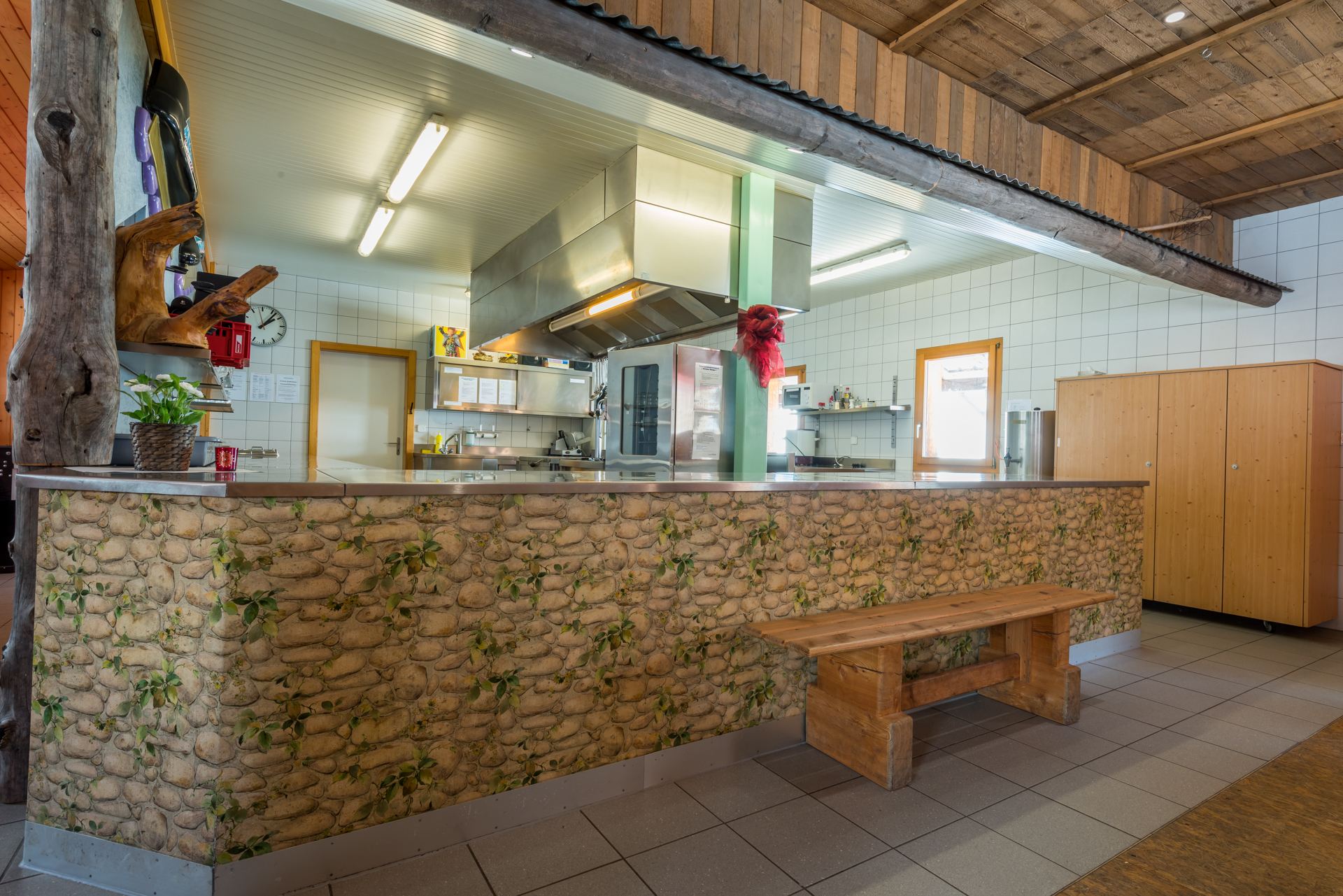 Ideal für grosse Gruppen. Dies ist der Speisesaal mit Grossküche und Treffpunkt für gemütliches Beisammensein. Er verfügt über eine top moderne Küche, so dass Gruppen bis 80 Personen ihre Speisen auch selber und individuell zubereiten können.