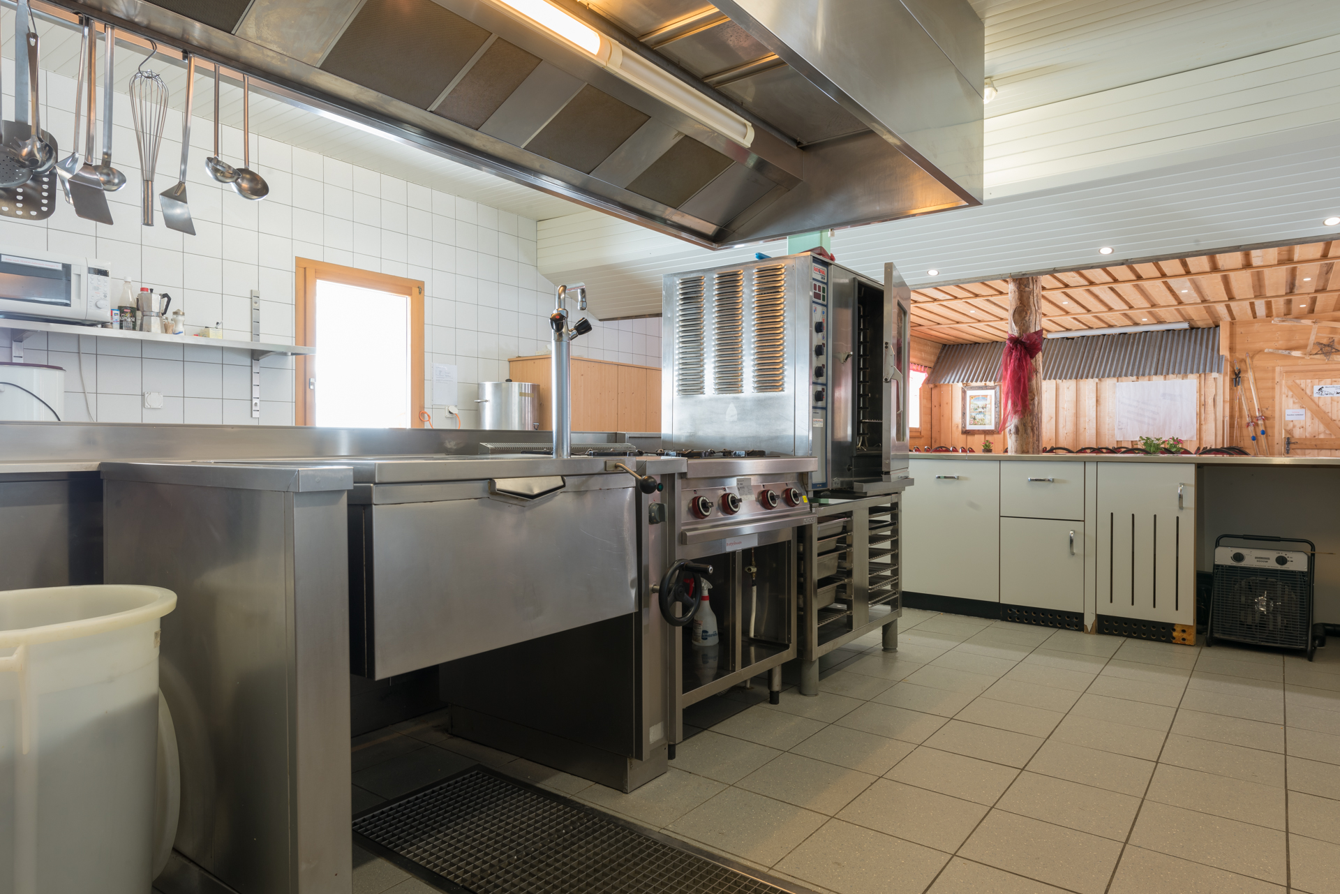 In der Grossküche stehen ein grosser Kühlschrank, Kippbratpfanne, Kombisteamer, Abwaschmaschine, Gastronorm-Schränke mit Schalen und allen notwendigen Utensilien, die einer Hotelküche ebenbürtig sind, auf Wunsch zur Verfügung.